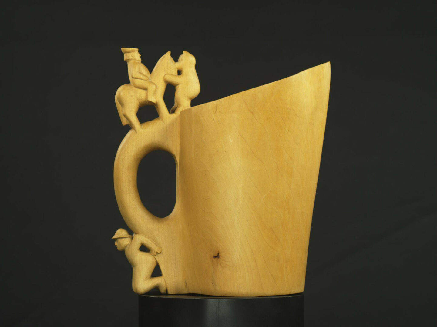 Horný okraj zošikmený smerom k uchu nádoby. Ucho v monolite zdobené rezanými plastikami: v hornej časti jazdec na koni, pred ním vstýčený medveď, na spodnom okraji ucha chrbtom opretý muž v klobúku. Nádoba s uchom sú z jedného kusu dreva, dno vsadené.