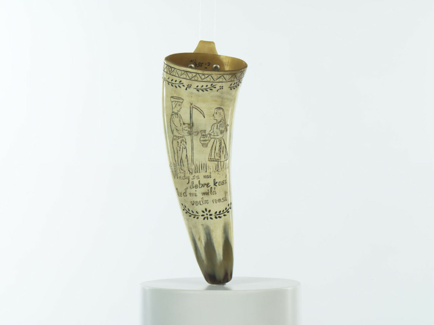 Oselník z rohoviny s háčikom na prichytenie. Zdobený je rytím a to pri obvode zúbkami s kolieskami, vetvičkami. V centre oselníka je vyrytý motív stojacich postáv – muža s kosou v ruke a dievčiny s krčiažkom v rukách. Pod nimi je nápis Vtedy sa mi dobre kosí, keď mi milá vodu nosí.