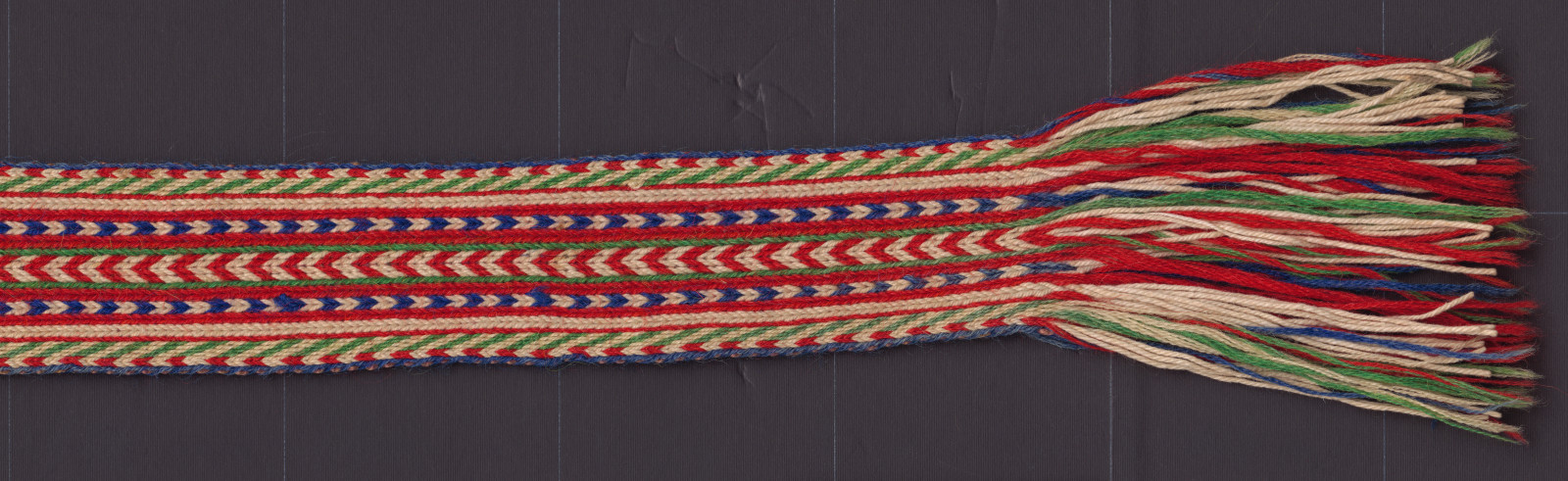 Pás z farebnej harasovej vlny je utkaný na kartičkách, konce tvoria strapce z vlnenej osnovy. Útok je pravdepodobne konopný špagát. Pás nosili ženy ku kroju ešte začiatkom 20,storočia. Z literatúry je známe, že pásy vyrábali remeselníci a predávali ich na jarmokoch.