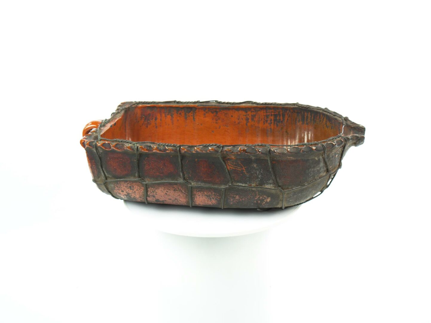 Pekáč keramický odrôtovaný, okraj spevnený vlnitý /retiazka/, s výlievkou na masť na jednej strane a s uchom na druhej strane, glazovaný. /výrazné známky po používaní/.
