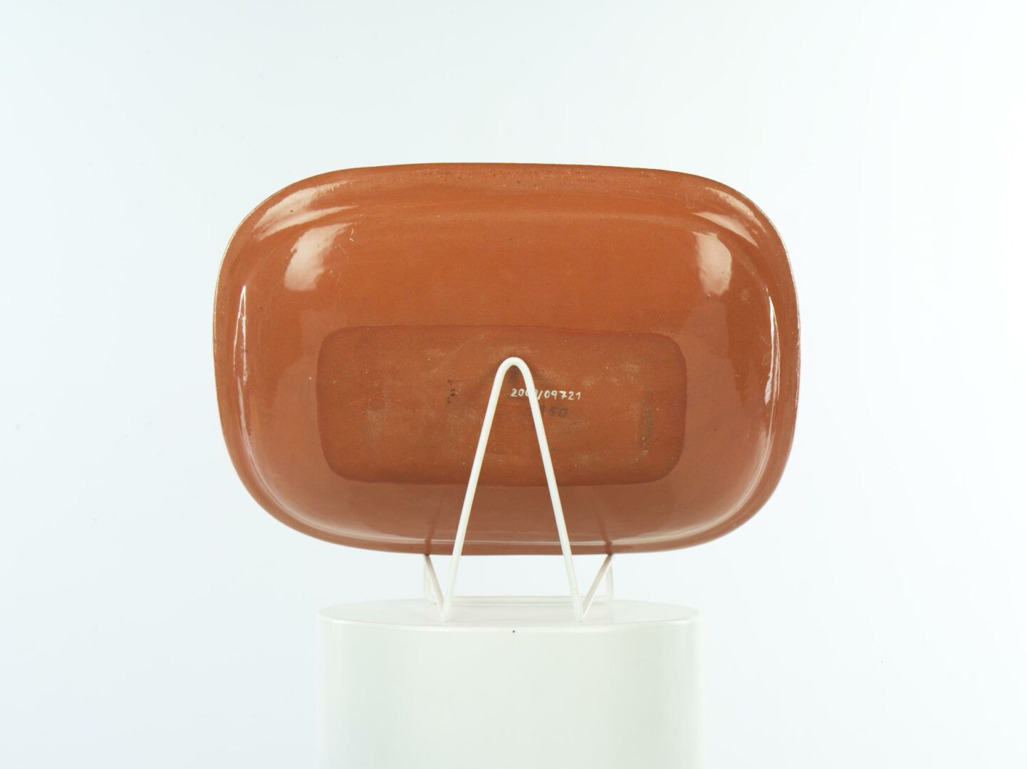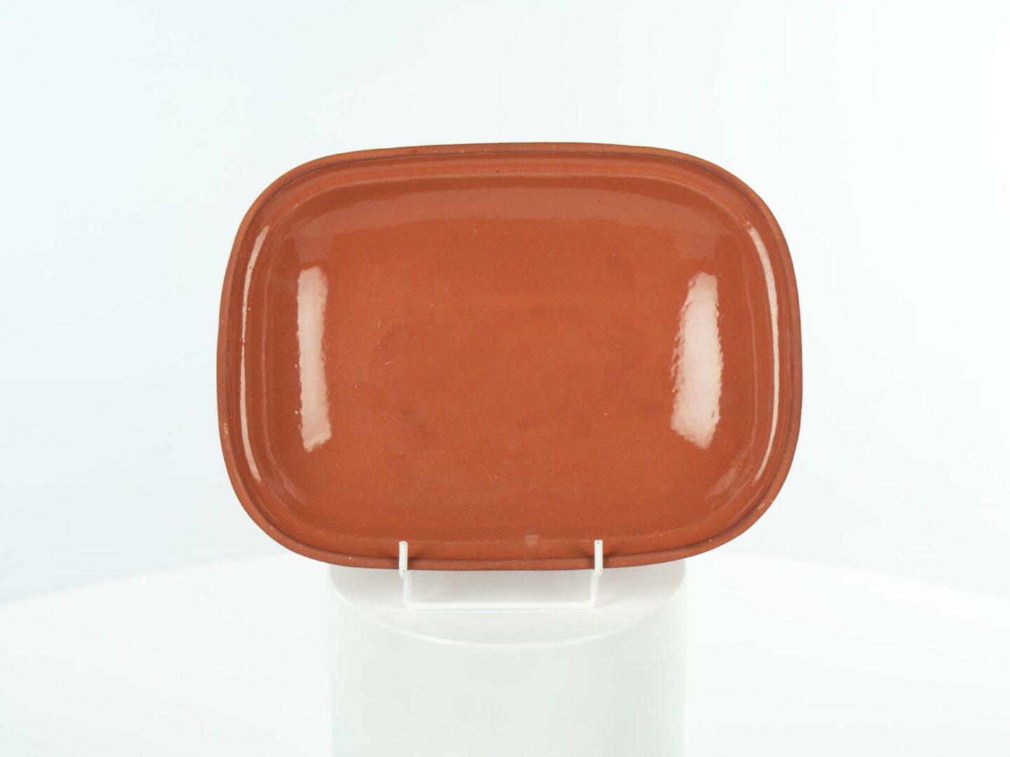 Pekáč keramický oválneho tvaru s vyhnutým okrajom, hnedá farba, glazúra.