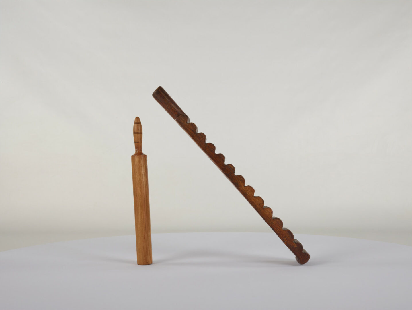 Piest na pranie, plochá drevená doska z tvrdého dreva jedna pocha hladká, druhá s priečnymi „pilovitými“ zárezmi. Rukoväť kruhového prierezu. Valec manglovací jednoduchý, rúčka zdobená vypaľovanými pásikmi.