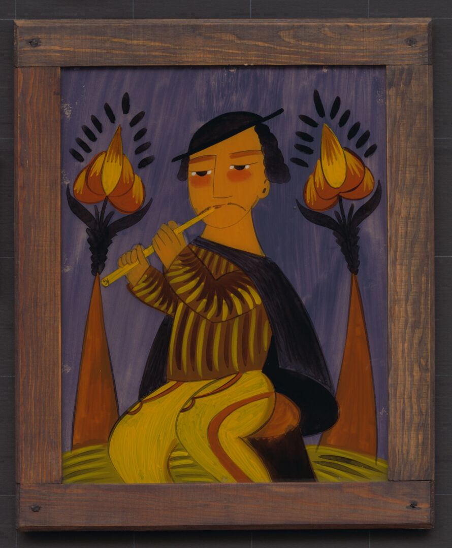 Maľba na skle: „Píšťalkár“ – ústredným motívom je sediaci muž s čiernym plochým klobúčikom na hlave, v žltých nohaviciach hrajúci na píšťalke, po jeho oboch stranáchčervené špice vo vrchole so štylizovanými plameňmi. Jednoduchý hladký drevený rám.