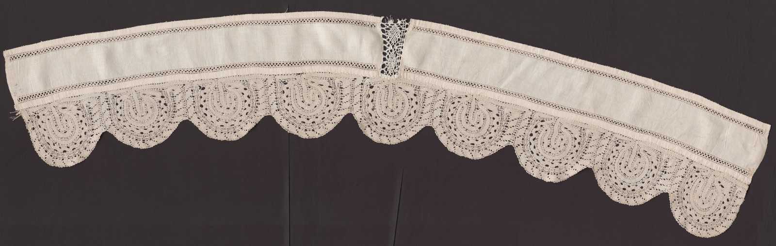 Spodná časť z kútnej plachty. Základný materiál domáce ľanové plátno. Výšivka je prevedená bielou balnenou priadzou ozdobnou ažúrkou a mešterkou. Časti sú zložená z dvoch šírok spojená paličkovanou čipkou. Na dolnom okraji je našitá široká pasiková čipka z ľanovej nite.
