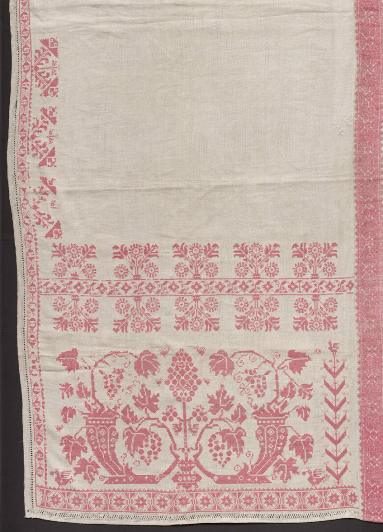 Kútna plachta dvojdielna spojená kupovanou preberanou vložkou. Základný materiál je ľanové plátno vyšívané vrkôčikovým krížikom a krížikom červenou kupovanou priadzou. Plátno je ukončené bielou hrachovinkou s mešterkou. Motívy na výšivke: hroznové lístie, obilie, kvety, vtáky a hviezdy. Výšivka na plachte je vyblednutá a na mnohých miestach vypadaná. Na spodnom okraji chýba čipka.