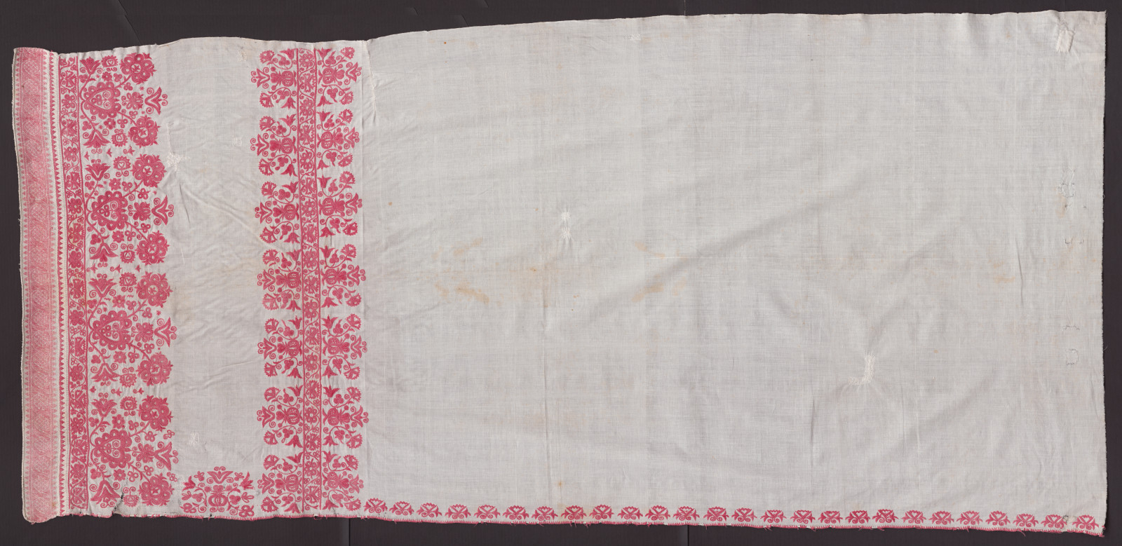 Časť kútnej plachty. Tenké bavlnené plátno, v spodnej časti výšivka červenou bavlnenou niťou háčikom „nemecká ihla“. Steh je retiazkový a plochý, vzory kľučky, lístky, hrebíčky. Na užšom konci je našitá červená továrenská tkanica.