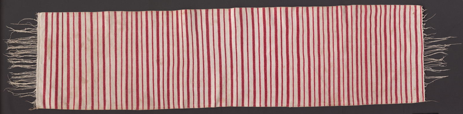 Plachta na posteľ, väzba ripsová, osnova biela bavlna, útok biela, červená a čierna bavlna, viacfarebné pásy. Plachta je ukončená strapcami.