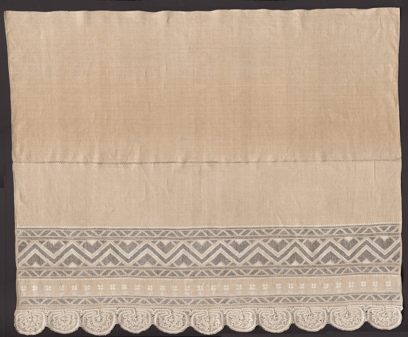 Posteľná plachta ušitá z dvoch šírok domáceho konopného plátna. Po dĺžke je spojená spojovacím švíkom. Jedna pola plátna je po celej dĺžke plachty bohato vyšitá a ukončená paličkovanou čipkou. Techniky výšivky: výrez, hladkovanie, formovanie, krížik, vrkôčikový krížik, ažúrka. Čipka je hlbockého typu paličkovaná z konopných nití a bieleho pamoku. Výšivka je šitá, ako čipka z konopných nití a bieleho pamoku.