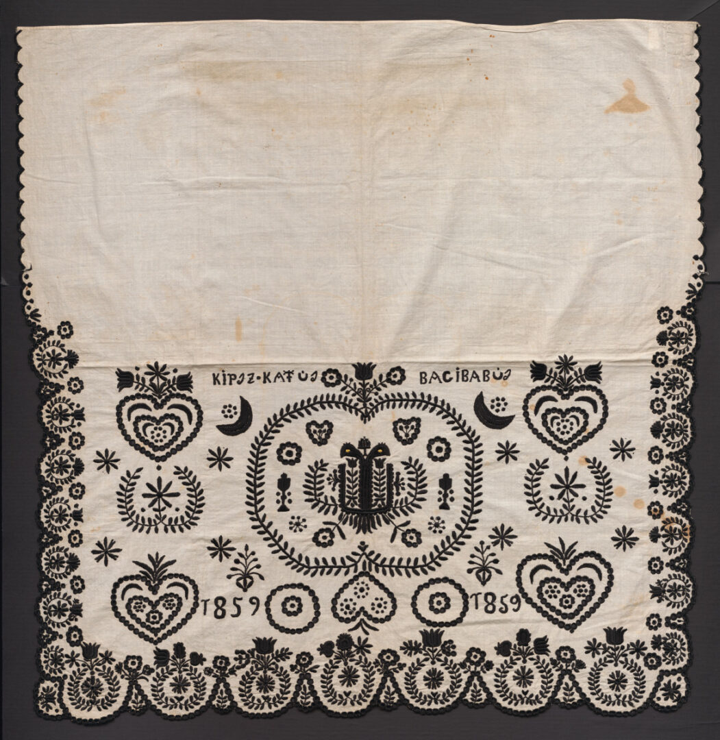 Plachta ušitá z bieleho bavlneného plátna. Vyšité čiernym hodvábom. Výšivka plná, stonkový a slučkový steh, vrkôčik. Ústredný motív jablka s jadierkami, po stranách sú srdiečka a kvety. Zakončenie vyšitými zúbkami.