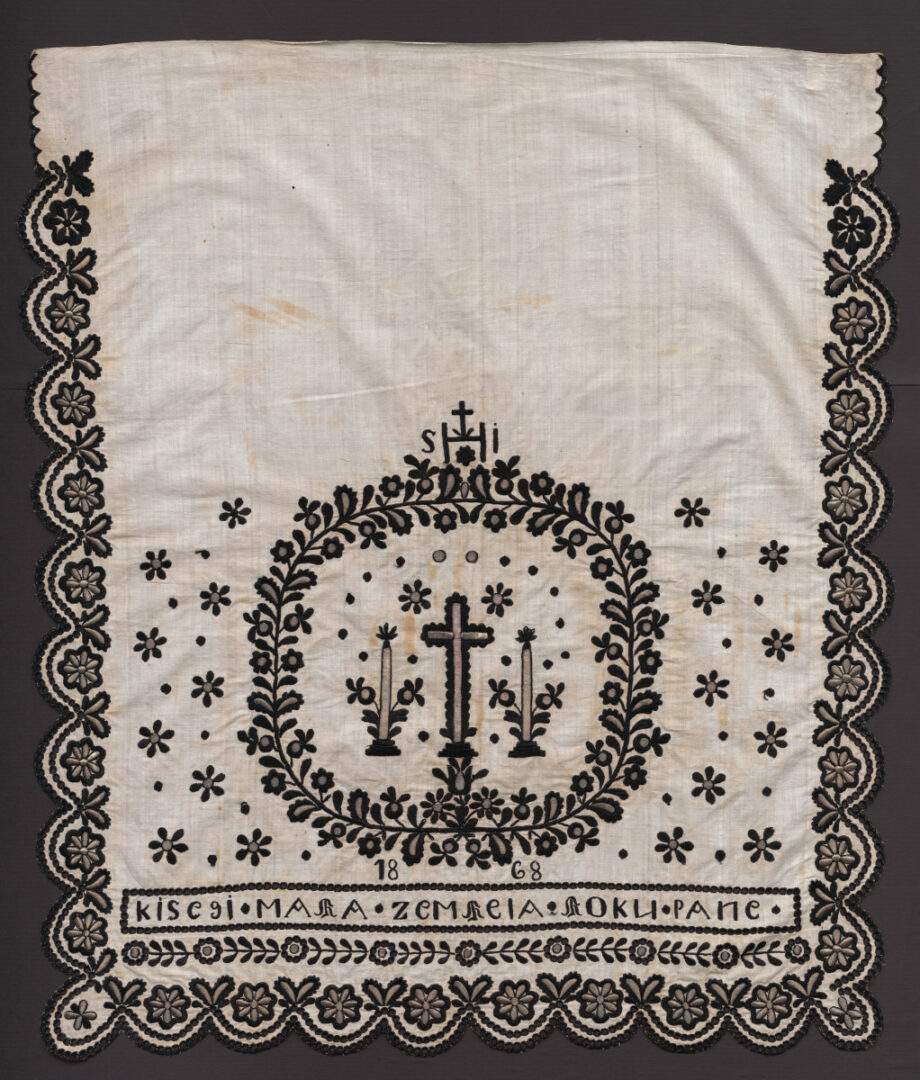 Smrtná plachta. Základný materiál je bavlnené plátno, výšivka čiernou vlnou a striebornou kovovou niťou. Stehy plný, stonkový, retiazkový, dierky, výšivka cez kartón. V strede je kríž, v spodnej časti meno, po obvode je rastlinný ornament.