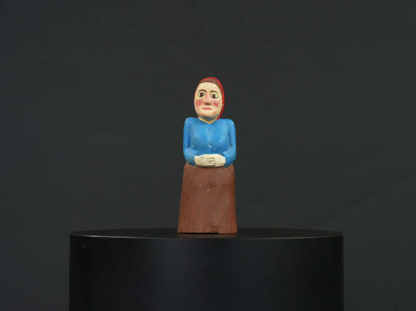 Plastika drevená maľovaná – žena v červenej šatke, modrej blúzke a dlhej hnedej sukni so zopätými rukami na bruchu. Obličej maľovaný.