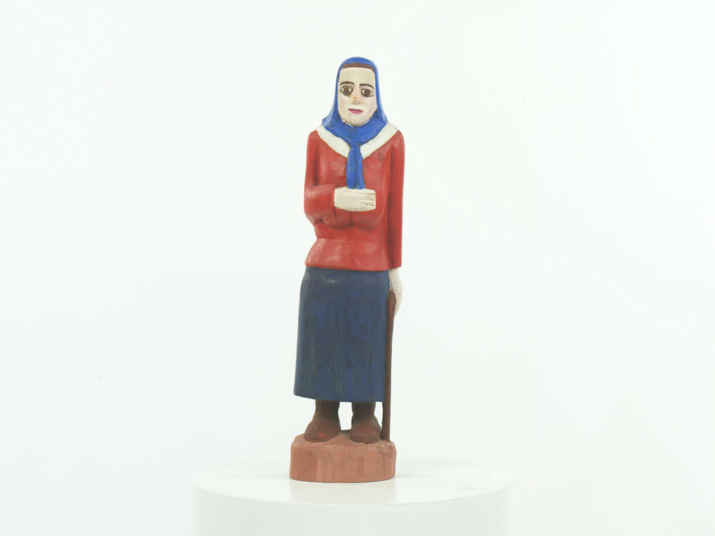 Plastika drevená, vyrezávaná, kolorovaná. Znázorňuje postavu ženy v červenom kabáte a modrej sukni s modrou šatkou cez plecia.