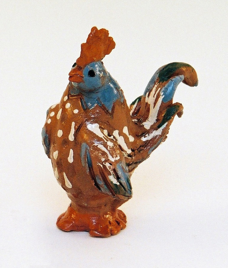 Základný tvar je ručne točený na hrnčiarskom kruhu, detaily domodelované, lepené šlikrom, farbené farebnými hlinkami, transparentná bezfarebná glazúra.