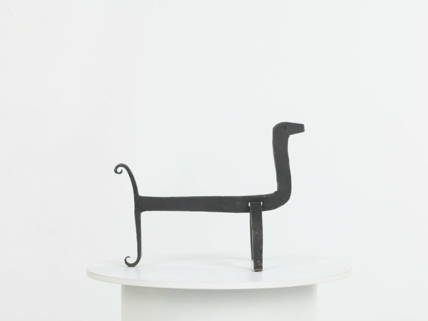 Plastika kovaná – pes, zhotovená kovaním z pásoviny, zahnutý trup s navareným chvostom a zadnou nohou z jednoho kusu, cez otvor v prednej časti trupu prevlečené predné nohy z jednoho kusu pásoviny.