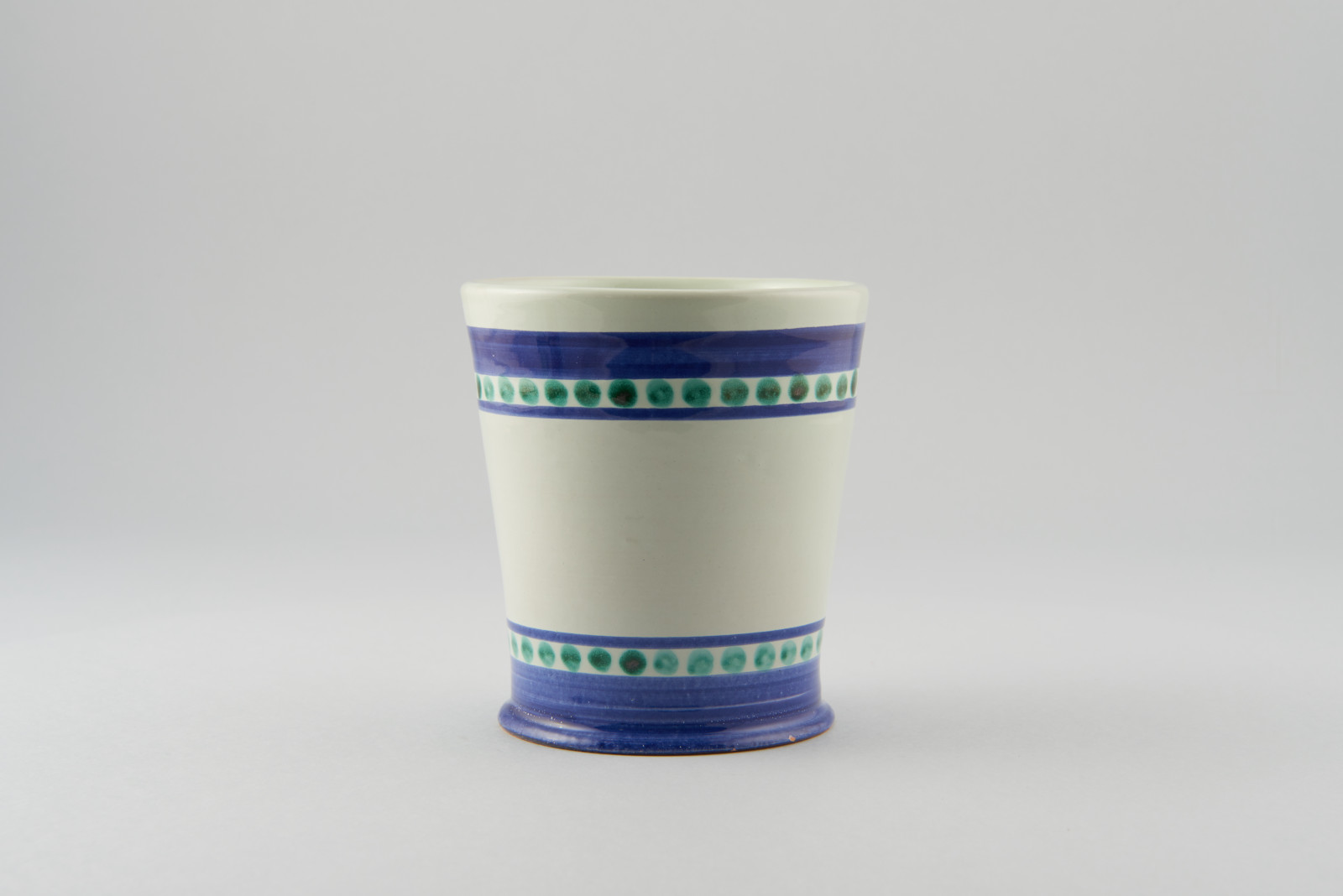 Pohár keramický, majolikový, točený na kruhu, rovný tvar, okraj širší ako dno. Dekor a farebnosť: modrý pás pod okrajom, zelené bodky po celom obvode, modrý pásik na spodnej časti. Biela glazúra.