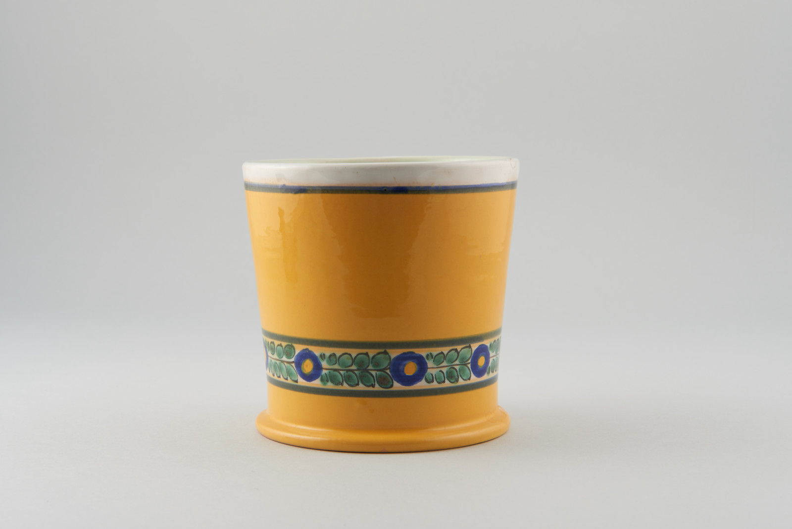 Pohár keramický majolikový, točený na kruhu, smerom od okraja sa zužuje, dno tvorí širší podstavec. Dekor: v spodnej časti dekoratívny pás s kvetmi a vetvičkami z lístkov. Farebnosť: modré kvietky so žltým stredom, zelené lístky, kontúra, podklad žltá glazúra z vonkašej strany, vnútorná strana a okraj biela glazúra.