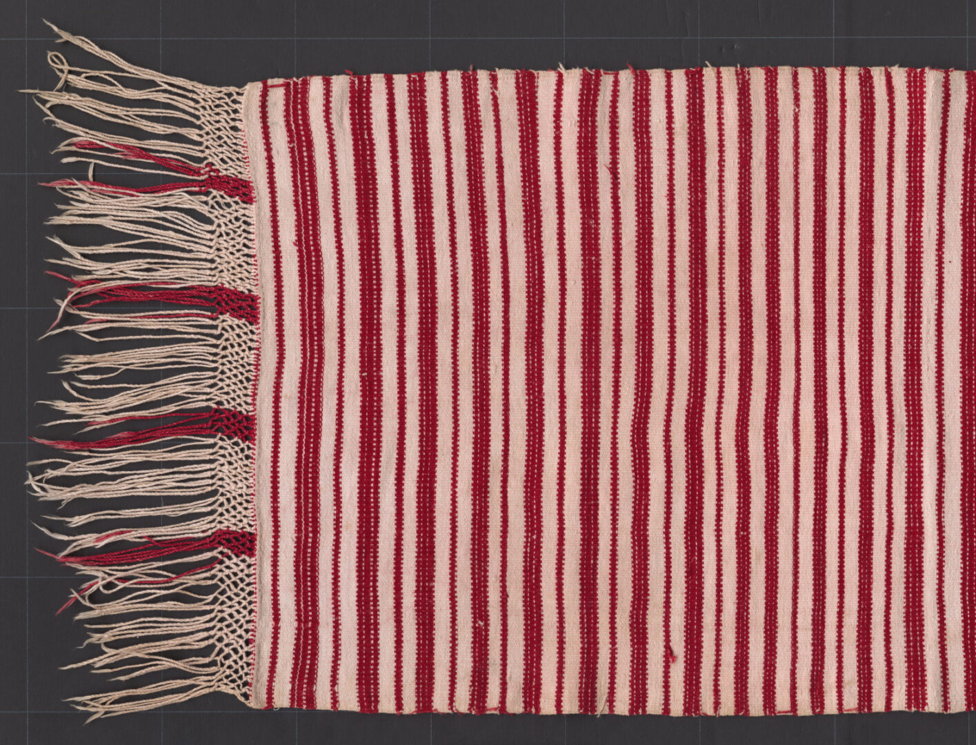 Pôlka tkaná ripsovou väzbou. Vzorovanie pozostáva s úzkych červených prúžkov po celej ploche pôlky. Ukončenie na oboch koncoch s viazanými strapcami