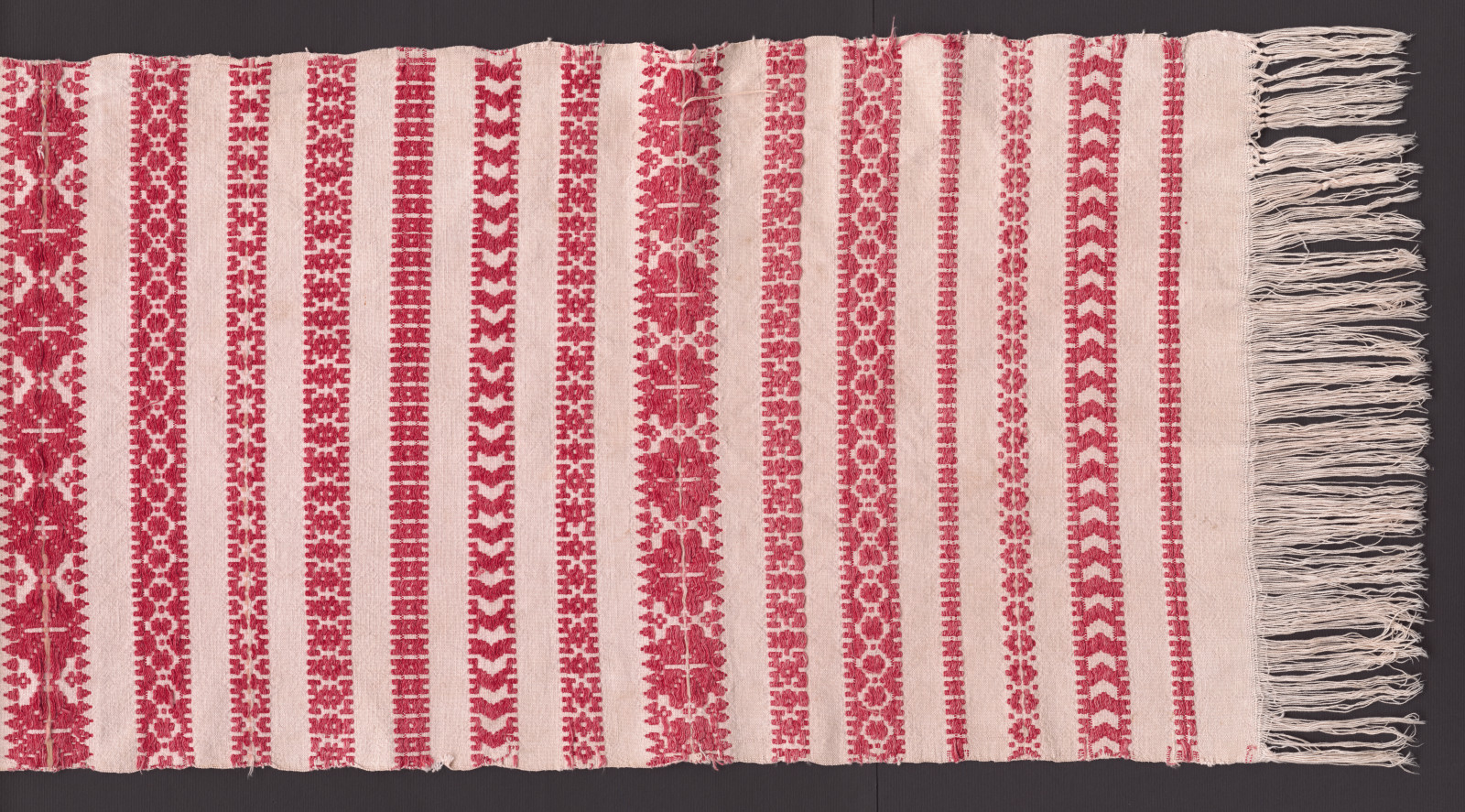 Časť pôlky tkanej plátnovou väzbou z prírodnej bavlny. Vzorovanie pozostáva z preberaných pruhov červenej farby rôznej šírky a vzorov.