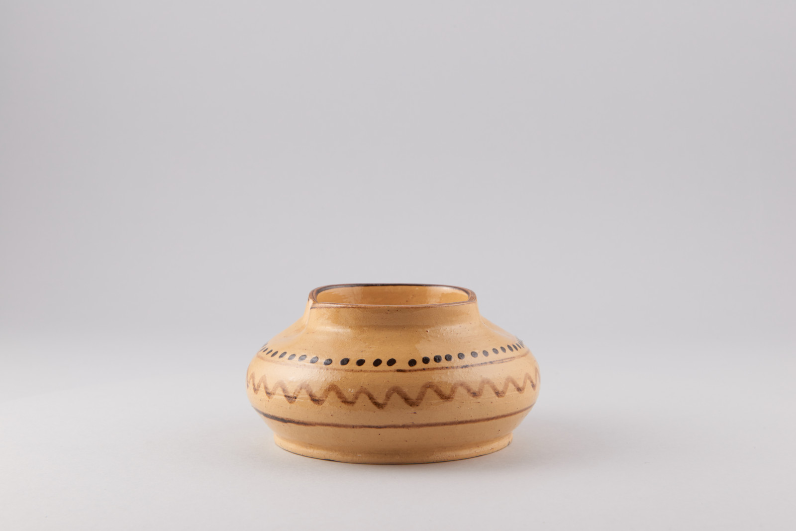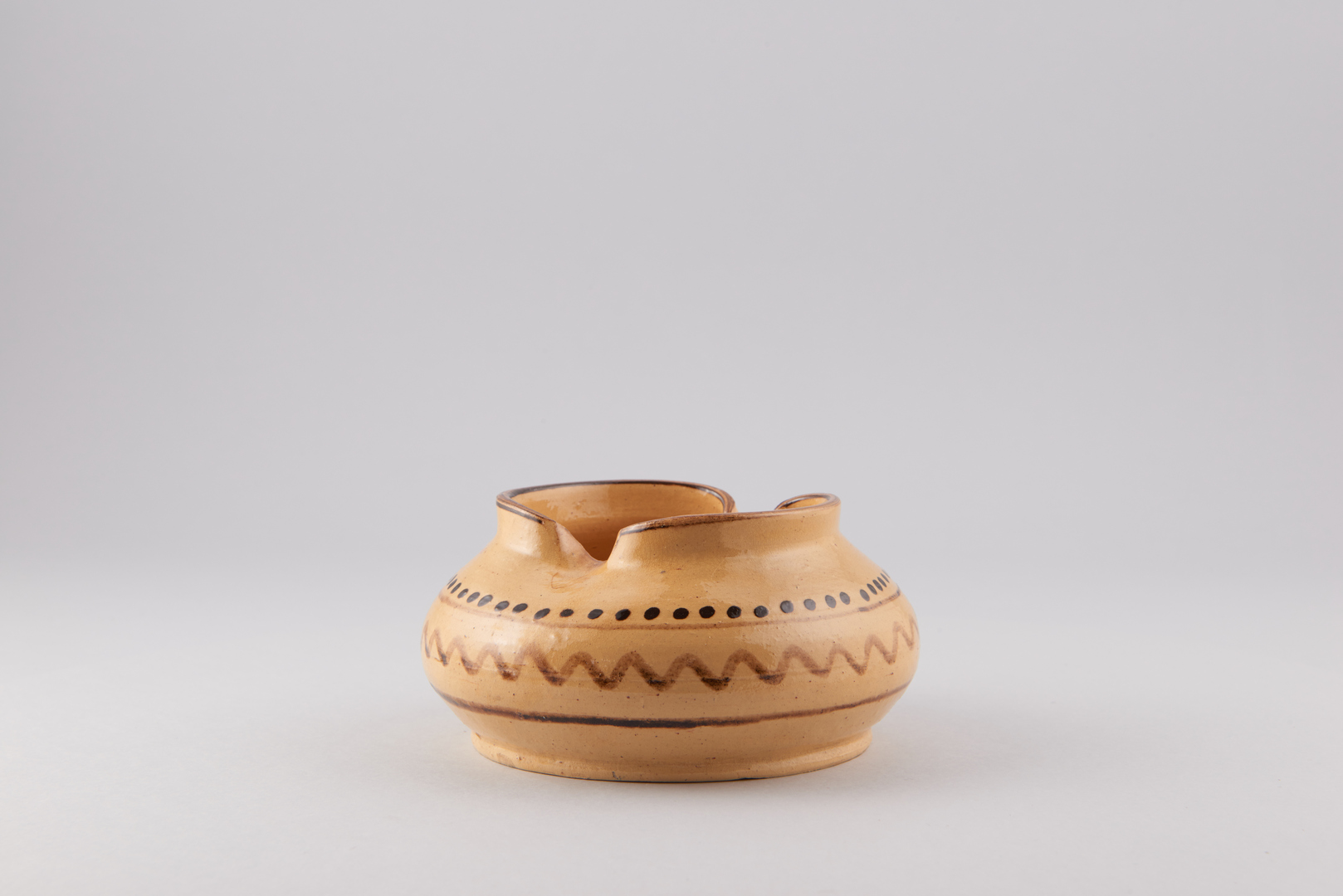Popolník z bielej hliny, točený na kruhu. Nad dnom sa steny rozširujú, k okraju zužujú, zvislý okraj je na dvoch miestach preliačený na cigarety. Dekor: po obvode stien vlnovka, čiary a rad bodiek. Farebnosť: dekor hnedý. Bezfarebná glazúra.
