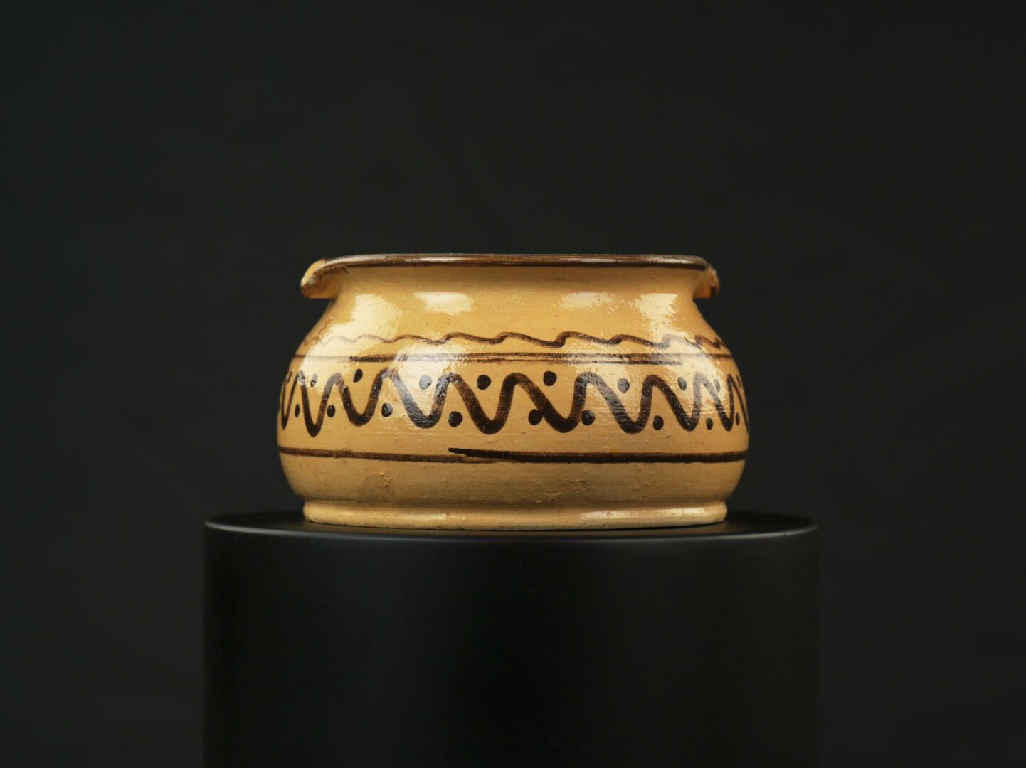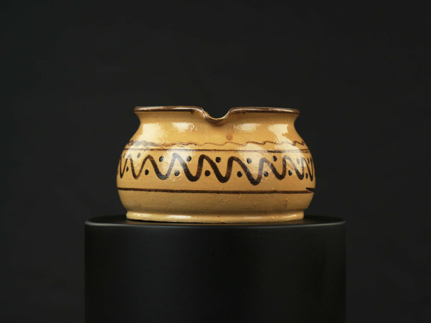 Popolník z bielej hliny, točený na kruhu. Mierne vyduté steny sa zužujú k okraju na vyhnutom okraji sú prstom preliačené miesta na cigarety. Dekor: na stenách po obvode vlnovka, bodky a obvodové čiary. Farebnosť: dekor hnedý. Bezfarebná glazúra.
