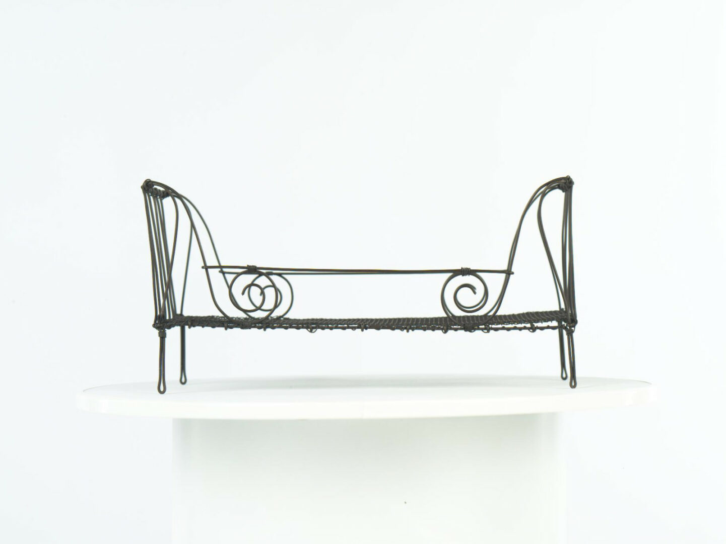 Drôtená miniatúrna posteľ vyrobená z počierneného drôtu.