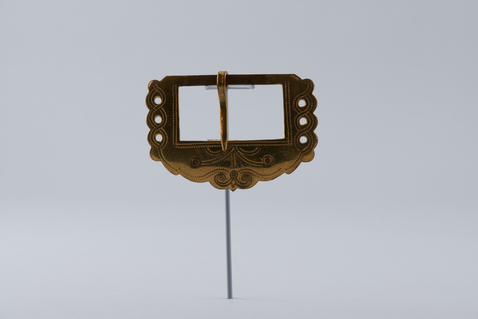 1. pracka mosadzná jednoduchá, štvorcového tvaru s úzkym rámom v tvare oblúčikov, s dvomi tŕňmi na zapínanie.