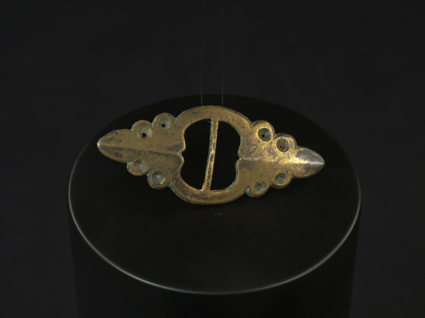 Pracka „spišská“, mosadzná, liata, „šošovkovitý“ tvar, s profilovanými bočnými krídlami, zdobenými prelamovaní a tepaním, hladká.