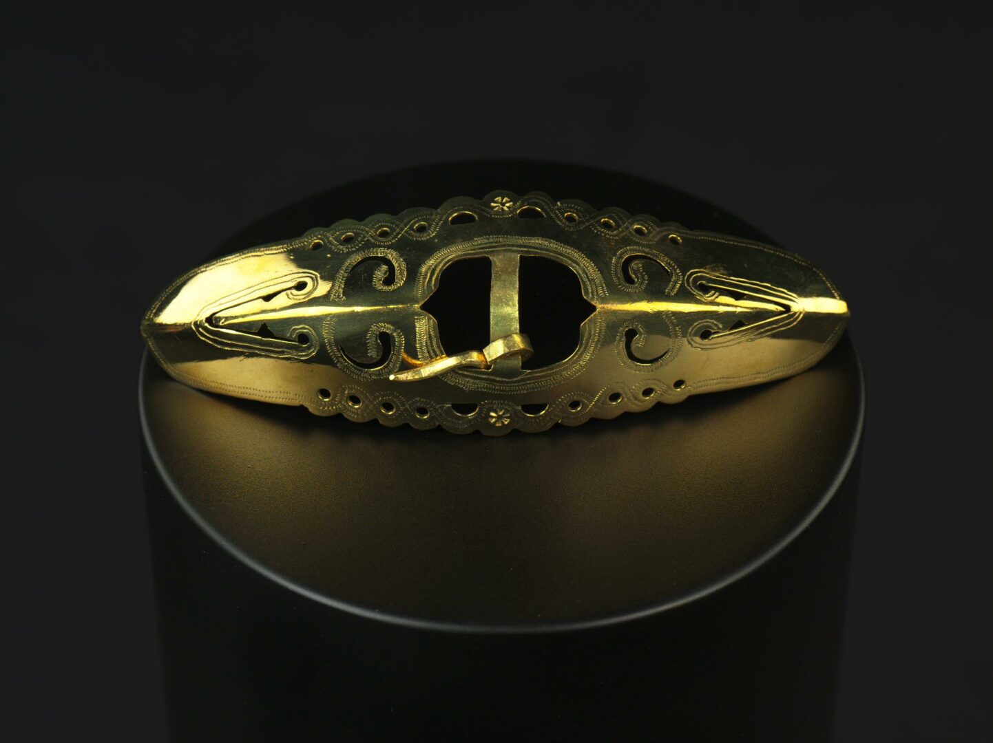 Pracka zhotovená prerezávaním, tepaním, razením a rytím je z mosadzného plechu.