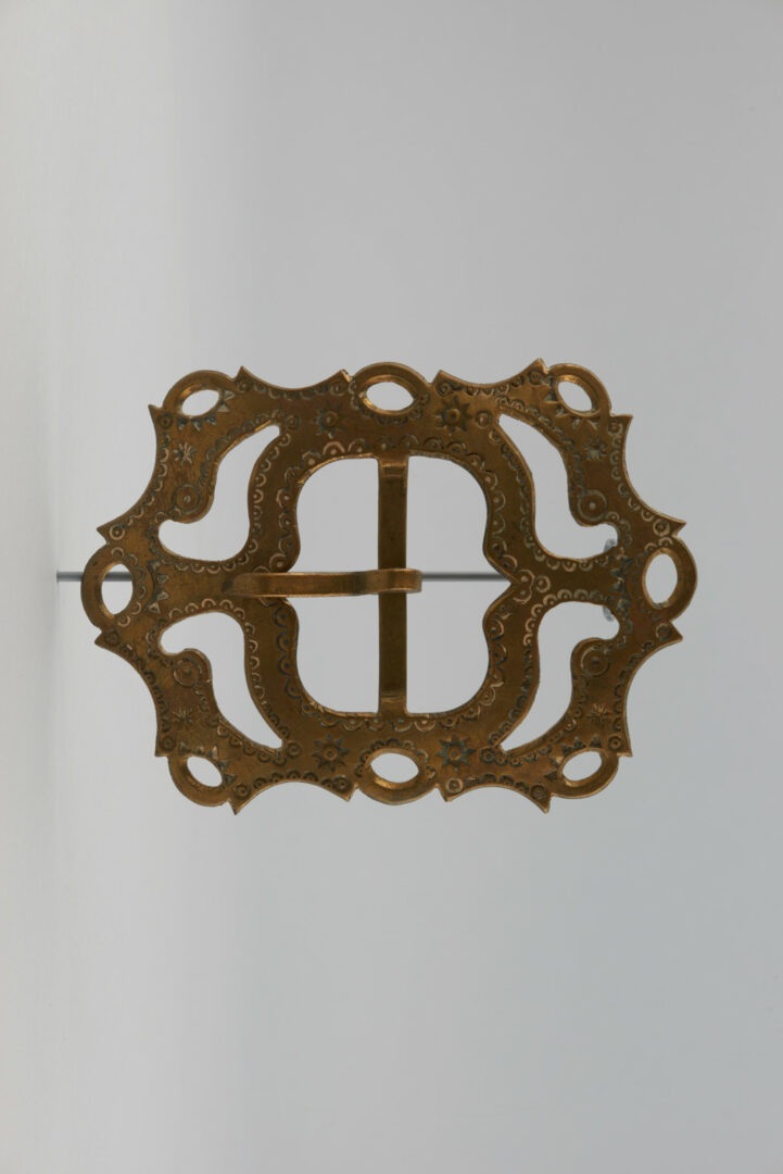 Pracka mosadzná, tvaru pozdĺžneho šesťuholníka s rozšírenými bočnými stranami. Zdobená bohatým prelamovaním a dozdobená razenými rastlinnými a geometrickými ornamentálnymi motívmi. Pracka na kravský zvonec.