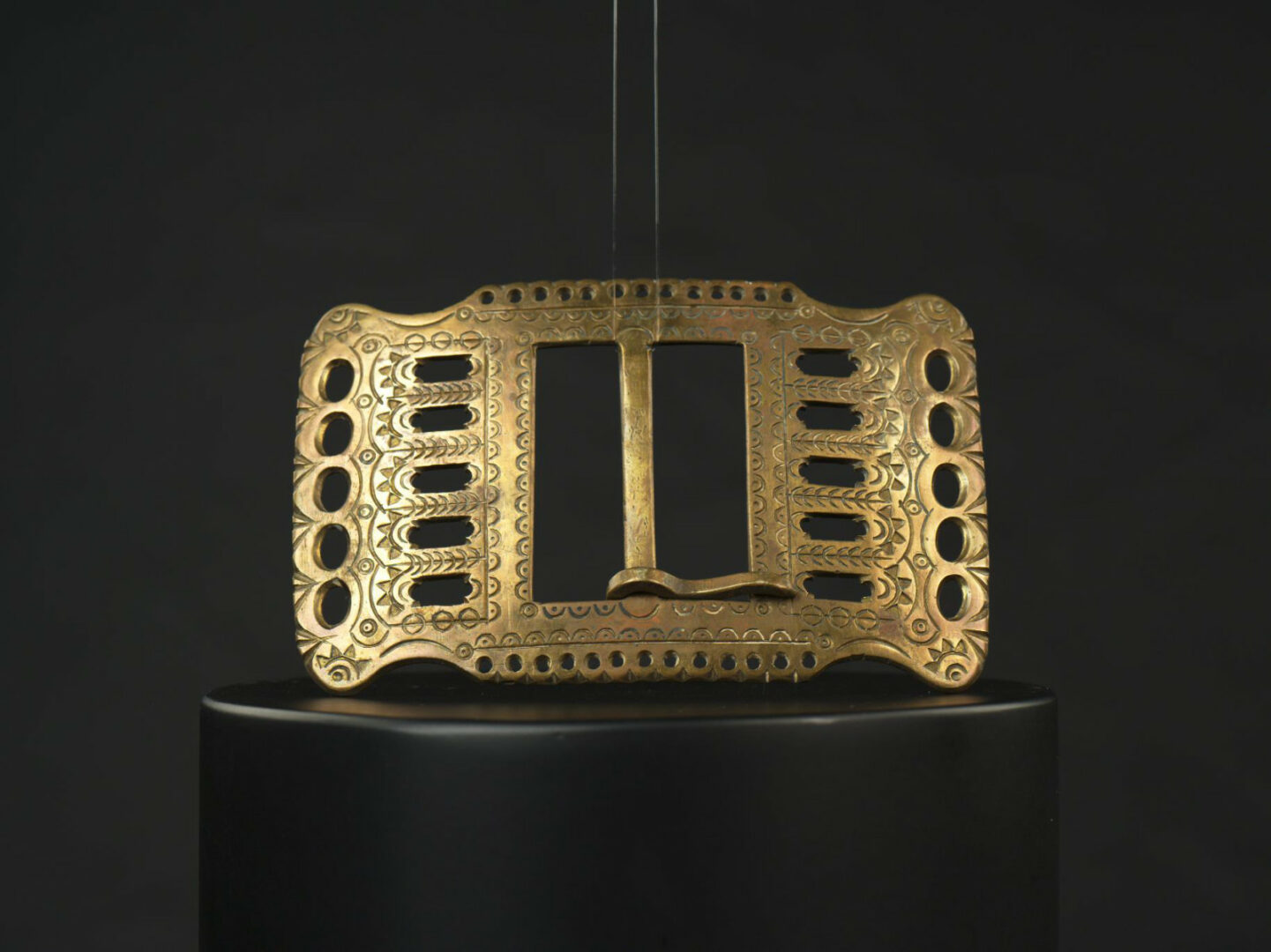 Pracka mosadzná, obdĺžnikového tvaru s rozšírenými bočnými stranami. Zdobená prelamovaním v tvare elíps a obdĺžnikov, dozdobená razenými rastlinnými a geometrickými ornamentálnymi motívmi. Pracka na kravský zvonec.