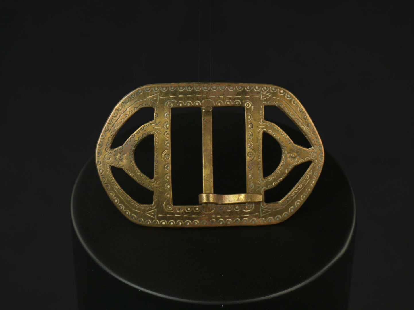 Pracka mosadzná, elipsovitého tvaru, prelamovaná, na obvodových a priestorových lištách zdobená razenými bodkami a oblúčikmi. Pracka na kravský zvonec.