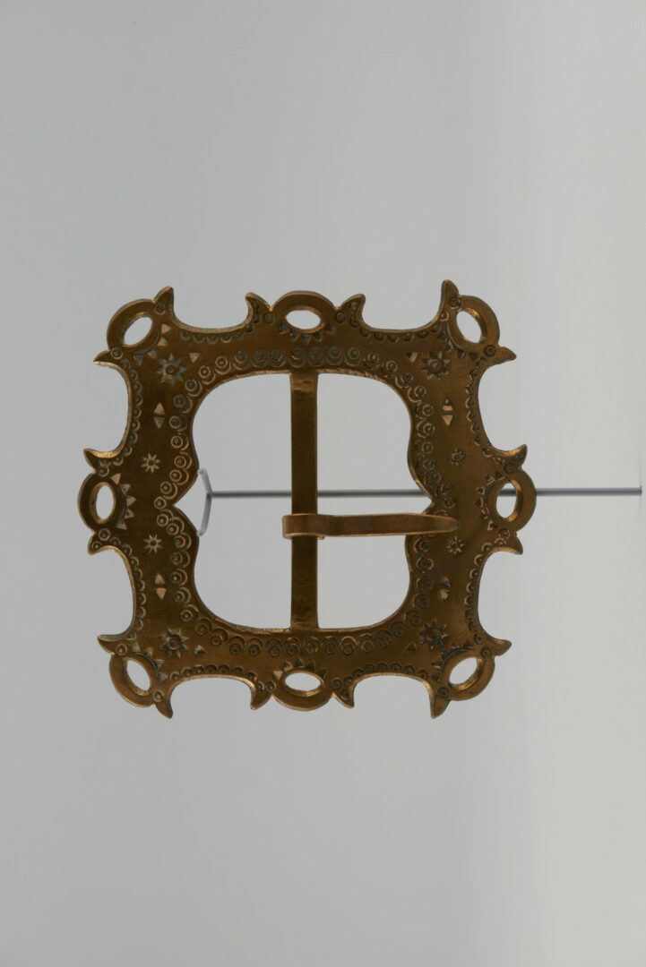 Pracka mosadzná, v tvare štvorca, bohato zdobená prelamovaním a vyrazenými geometrickými ornamentálnymi motívmi. V polovici každej strany rovnaké zdobenie ako na rohoch pracky. Pracka na kravský zvonec.