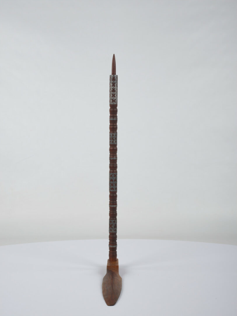Praslica drevená – torzo, sústružená žŕdka je zdobená geonmetrickými ornamentálnymi motívmi vylievanými cínom, v spodnej časti je vertikálne osadená do príšľapnej dosky. Chýba jedna (nadstavitelná) časť žŕdky.