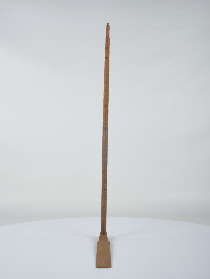 Praslica drevená – žŕdka zložená z dvoch do seba zasunutých častí je vertikálne vsadená do spodnej príšľapnej dosky. Žŕdka je do dvoch tretín dĺžky zdobená v piatich horizontálnych poliach geometrickými ornamentálnymi motívmi vylievanými z cínu.