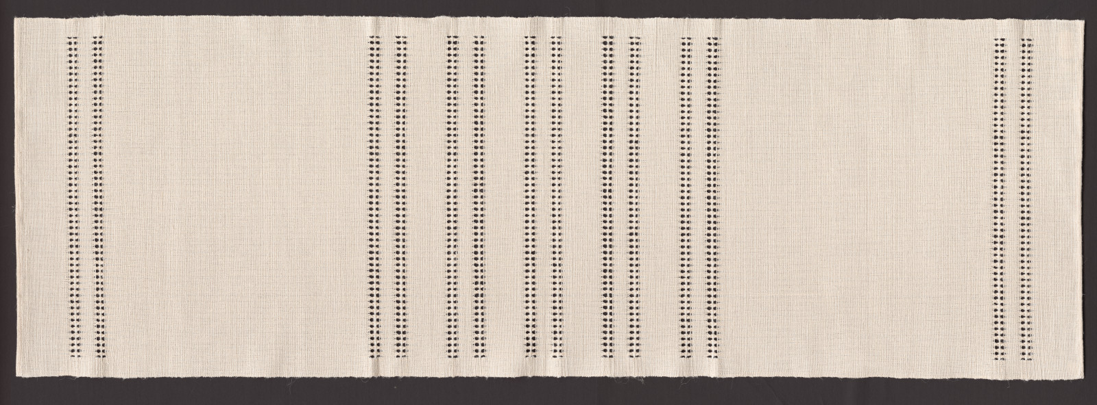 Prestieranie v prírodnej farbe pretkávané v strede 10 ažúrami, na koncoch 2×2 ažúry. Materiál: osnova – bavlna, útok – ľan Technika: plátnová väzba, ažúrová technika