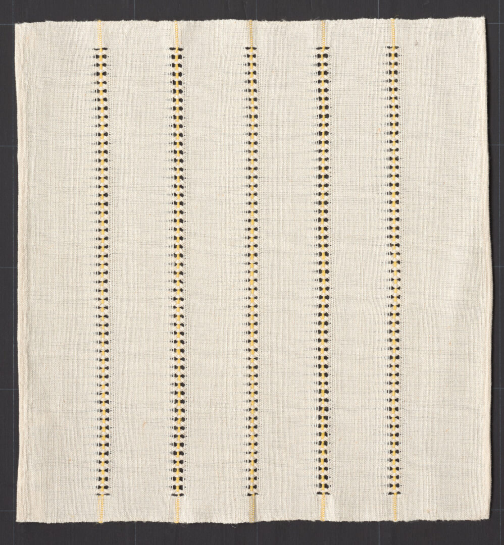 Prestieranie ručne tkané zhotovené z ľanových a bavlnených nití v prírodnej farbe. Vzor na prestieraní tvorí 5 ažúr prepletených žltou ľanovou niťou. Návrh: Janka Menkynová, ÚĽUV Výrobca: Amália Schonová