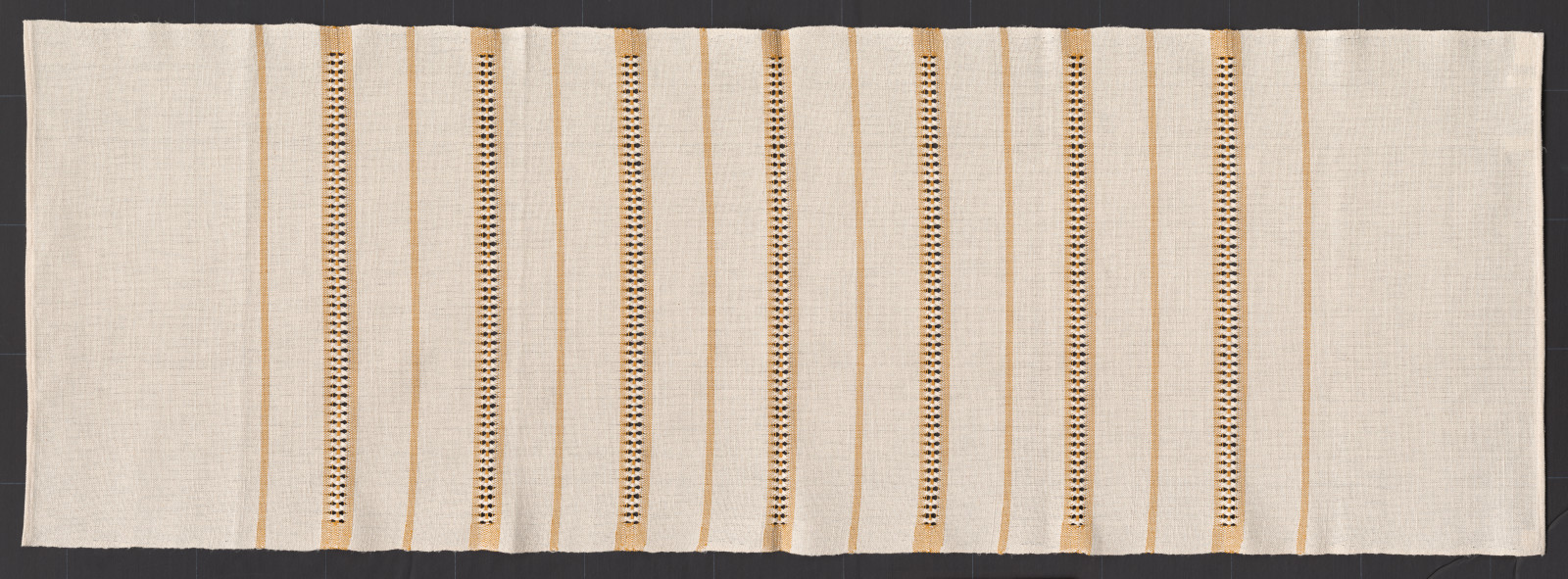 Prestieranie tkané plátnovou väzbou s ažúrami. Osnová je zhotovená z bavlnenej priadze, útok je zhotovený z ľanovej priadze. Prestieranie je prírodnej farby a po celej jeho dĺžke sú striedavo rozložené ažúry a úzke prúžky horčicovej farby.
