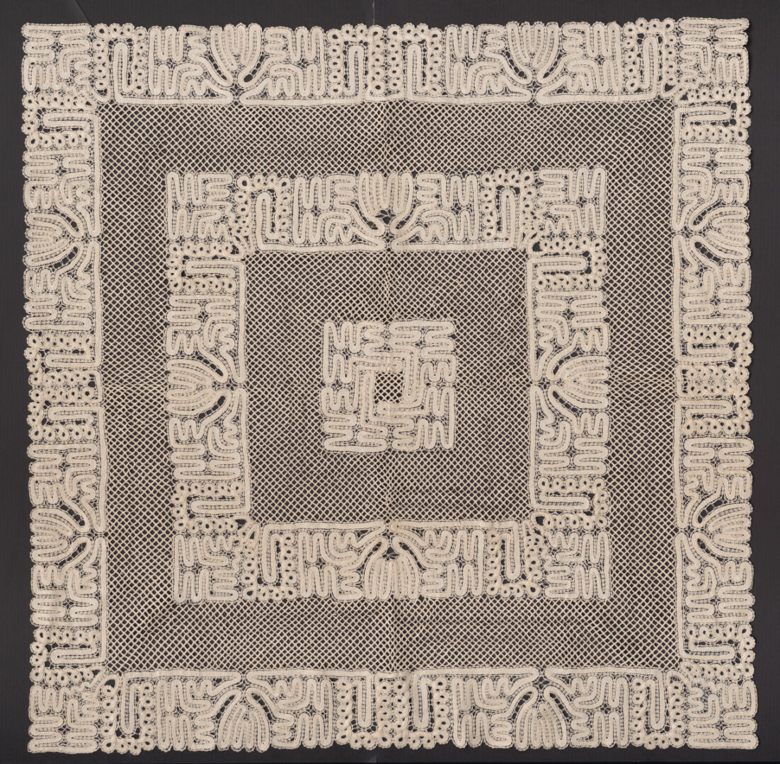 Paličkovaná prikrývka z lesklých a matných bavlnených nití, farby ecru. Väzby plátenko, dvojpárové pletence a zákrutky. Použitý motív z rejdovského čepca.