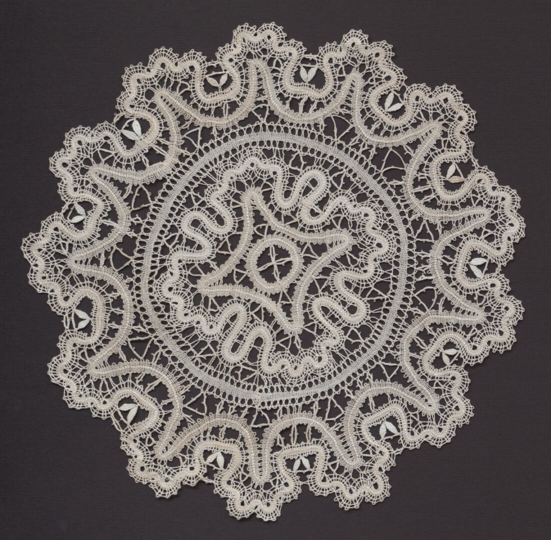 Prikrývka z paličkovanej čipky. Materiál biela bavlnená niť na šitie, väzby jedno a dvojpárové pletence, obe plátenká, mitky, vypletané hrubé nite. Čipka pásiková. Nie celkom typická pre Soľnú Baňu.
