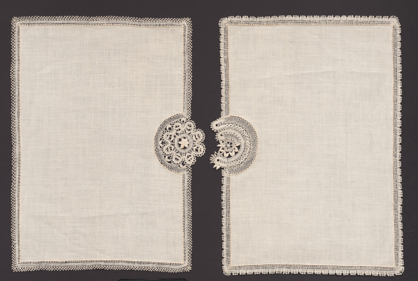 Prikrývky (2 ks) zdobené úzkou paličkovanou čipkou našitou po obvode. V strede dlhšej strany čipka ústí do okrúhleho motívu (kvet, vtáčik). Autor návrhu: Božena Janeková, 1984 Realizátor: Jozefína Majerská, Staré Hory