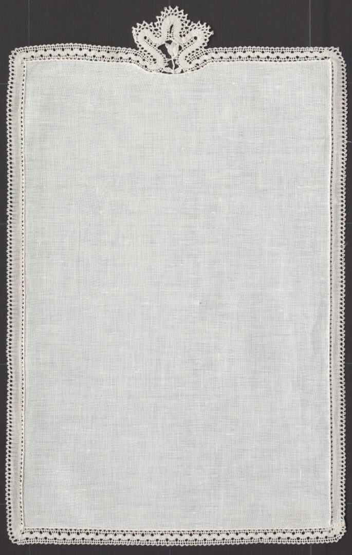 Prikrývky – 3 kusy – sú zdobené úzkou pásikovou paličkovanou čipkou našitou po celom obvode prikrývky, ktorá v strede úzkej strany ústí do motívu. Autor návrhu: Božena Janeková, 1989 Realizátor: Jozefína Majerská, Staré Hory