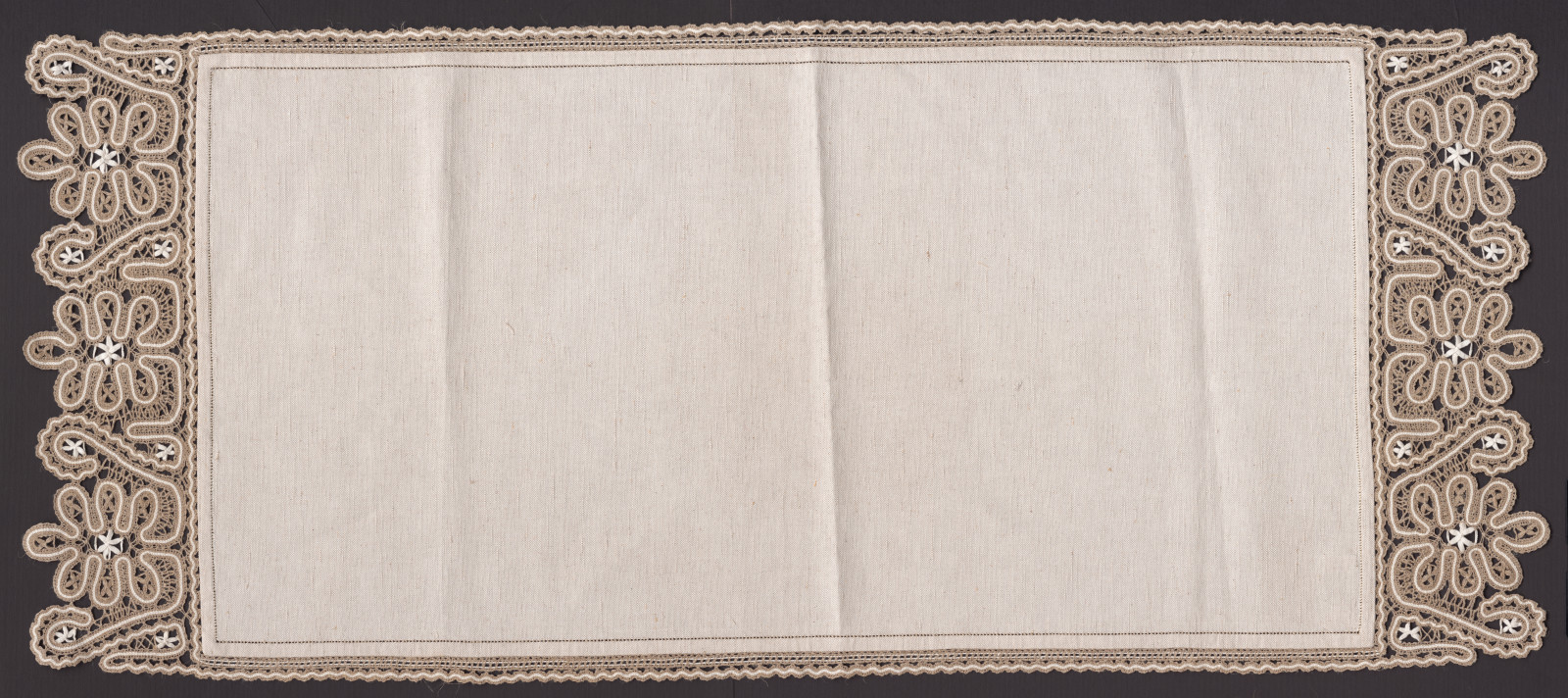 Prikrývka s pásikovou paličkovanou čipkou umiestnenou na oboch užších koncoch, vzor je inšpirovaný tradičnou čipkou z oblasti Hlboké. Autor návrhu: Božena Janeková, 1980 Realizátor: Adela Žiaková, Staré Hory
