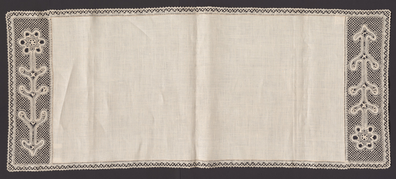 Prikrývka s paličkovanou čipkou umiestnenou na oboch užších koncoch. Motív kvetu na stonke vychádza zo spišských tradičných čipiek. Autor návrhu: Božena Janeková, 1984 Realizátor: Jozefína Majerská, Staré Hory
