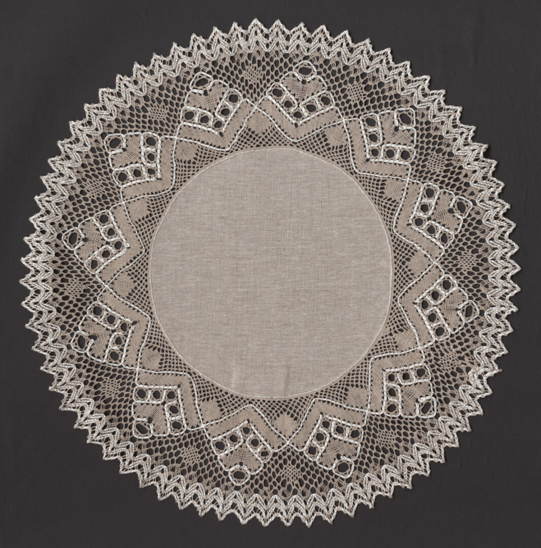 Prikrývka s paličkovanou čipkou zo Španej doliny riešená do kruhu. V strede prikrývky sa nachádza ľanové plátno tkané plátnovou väzbou (priemer 26 cm). Okolo plátna je našitá čipka z ľanových a bavlnených nití široká 13 cm. Farba nití je prírodná ľanová a biela bavlená. lokalita: Špania Dolina autorka, rok návrhu, rok výroby: Alžbeta Mrázová, 2010, 2010