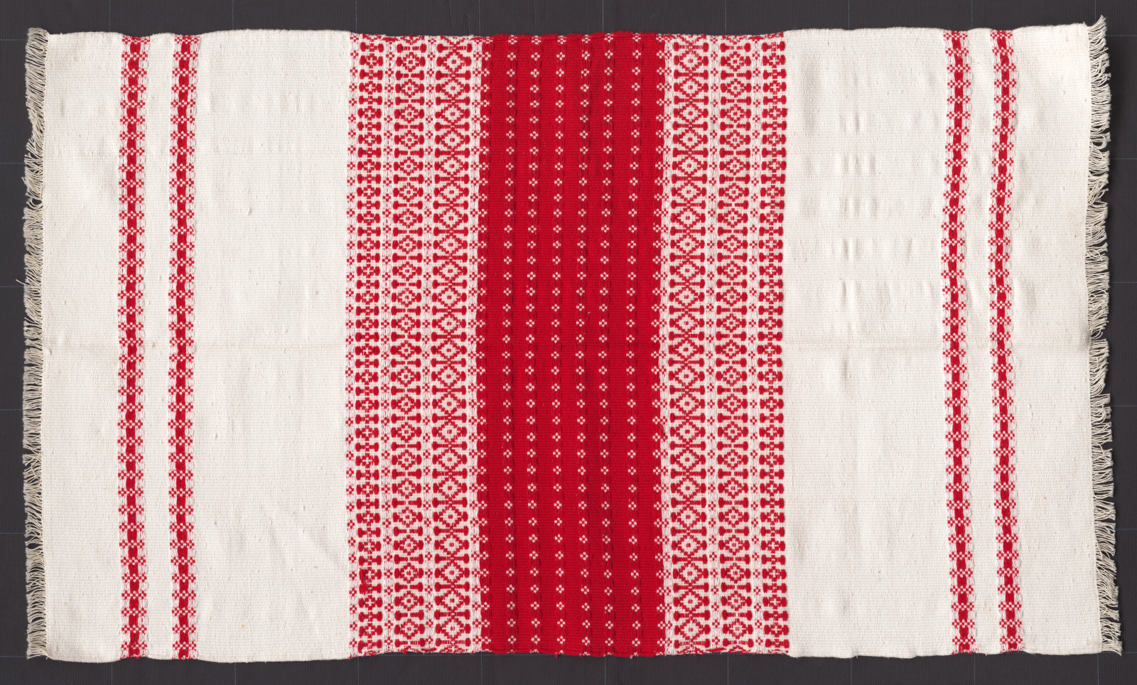 Tkaná prikrývka zhotovená z bavlnených nití. V bielom ripsovom základe sú červené pásy tkané ripsom a preberaním. Prikrývka je na koncoch ukončená strapcami.