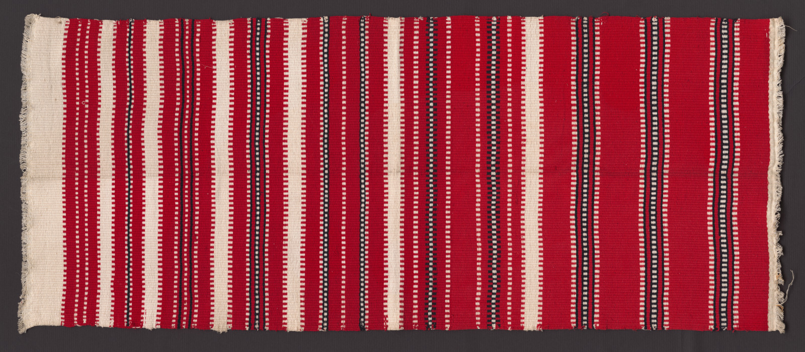 Tkanina je tkaná ripsovou väzbou, osnova aj útok sú z bavlny. Vzor tvoria červené pruhy so zúbkami, ktoré sa od jedného okraja k druhému rozširujú. Pruhy sú zdobené bielymi kockami a čiernymi pásmi. Na koncoch tkaniny sú krátke strapčeky.