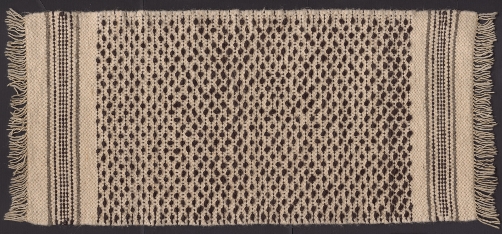 Tkaná prikrývka, osnovné aj útkové nite sú vlnené, prikrývka je ukončená strapcami.