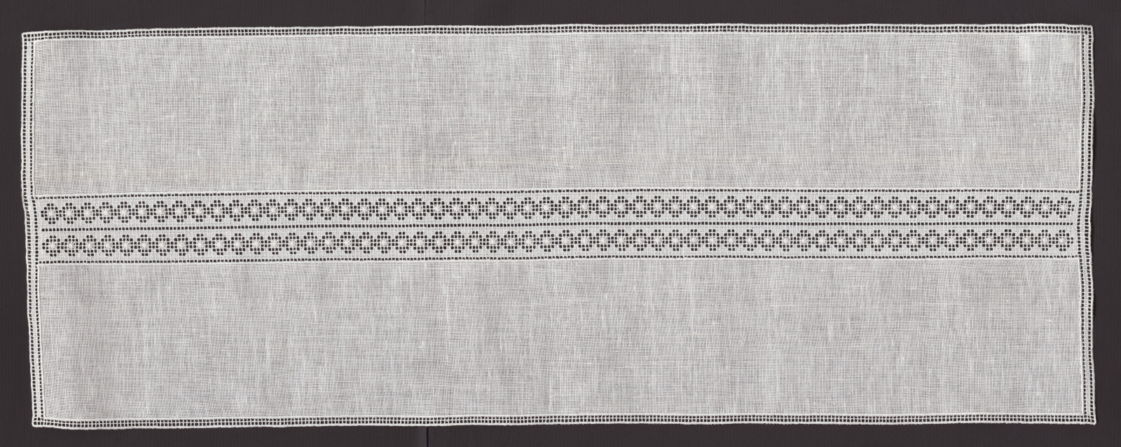 Prikrývka zhotovená z ľanového plátna a vyšitá bielou bavlnkou technikou toledo, stredom prechádza pás s kruhovými motívmi. Technika údajne pochádza z obce Chotín, postupne sa rozšírila do okolitých obcí. Pôvodne sa ňou vyšívala dámska bielizeň, výbavy, stolová a posteľná bielizeň.