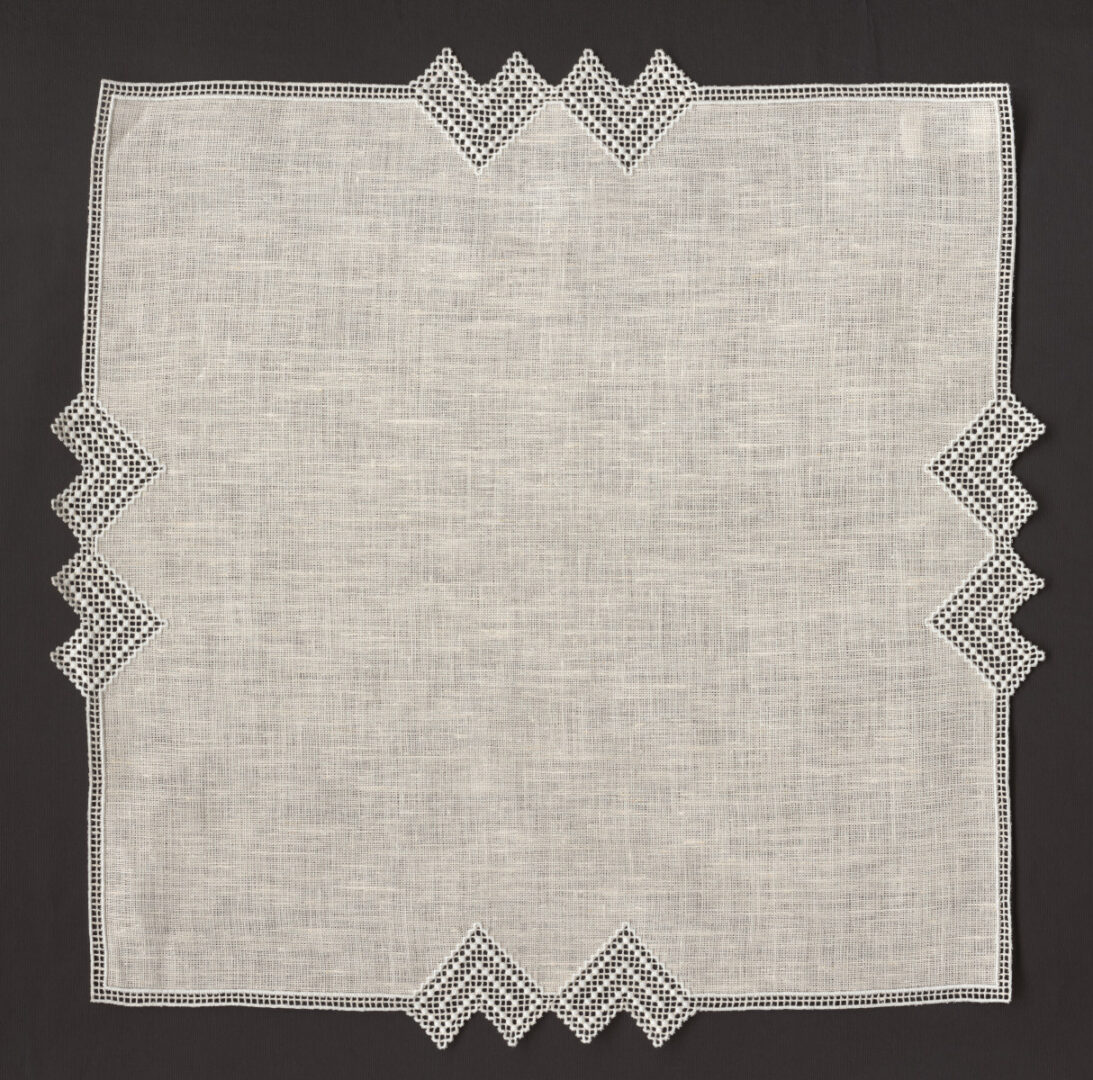 Prikrývka štvrocového tvaru zhotovená z ľanového plátna a vyšitá bielou bavlnkou technikou toledo, na všetkych stranách motív sŕd. Technika údajne pochádza z obce Chotín, postupne sa rozšírila do okolitých obcí. Pôvodne sa ňou vyšívala dámska bielizeň, výbavy, stolová a posteľná bielizeň.