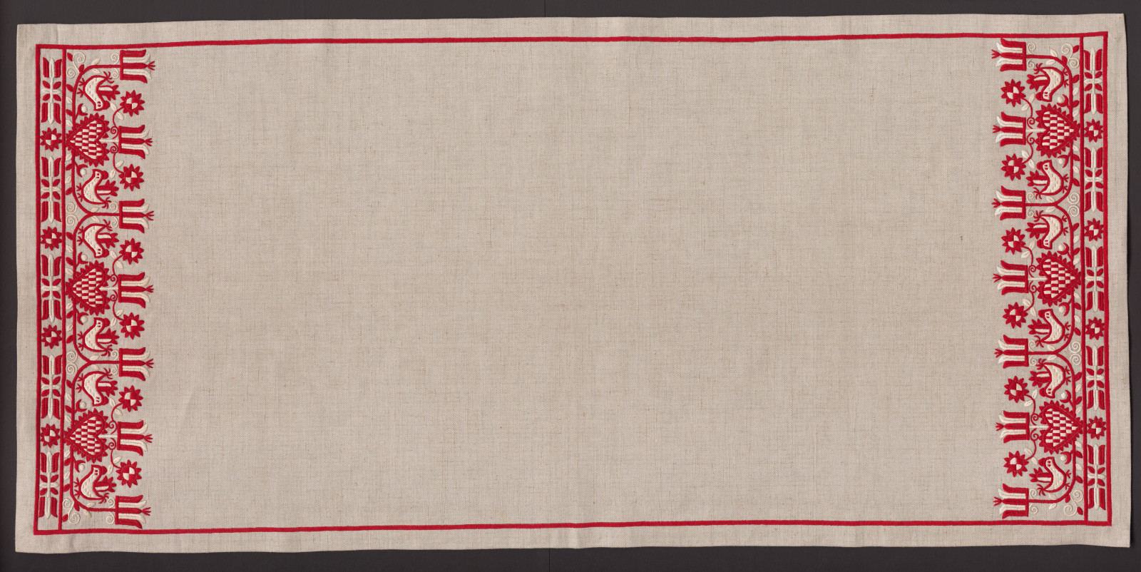 Prikrývka obdĺžnikového tvaru. Režné plátno je vyšité predkreslenou výšivkou v červeno-bielej farbe. Motív znázorňuje srdce z ktorého vyrastajú rastlinné úponky, z oboch strán srdca sú vyšití vtáčikovia. Motív je umiestnený na koncoch prikrývky, použité techniky sú hladkovanie a stonkový steh. Lokalita: Senica.